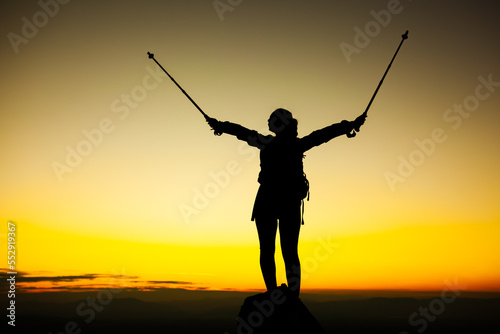 Silhouette of a hiker girl on a rock pedestal with hands up. Beautiful orange sunset.