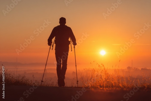 Silhouette of a male hiker with trekking poles walking along a path at sunrise, surrounded by misty landscape, capturing the essence of adventure and exploration in nature