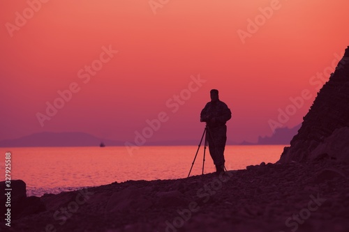 Silhouette of a male photographer by the sea during sunset it makes picturesque pictures of hills and landscapes on sunny summer evening. Nature photography concept. Advertising space