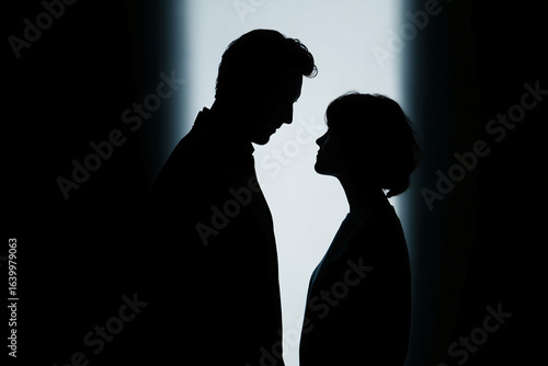 Silhouette of a man and woman in a romantic moment. They are looking at each other in the dark, creating an atmosphere of intimacy and connection.