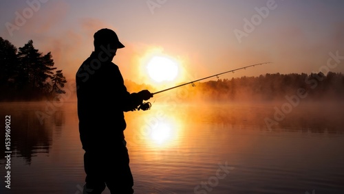 fishing, man, sunset, lake, silhouette, sunrise, water, nature, summer, morning, calm, peaceful, solitude, hobby, relaxation, leisure, sport, angler, rod, reel, mist, fog, gold, hours, scenic, view, sky, tree