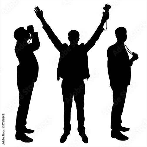 Silhouette of a man in a business suit. A man with binoculars in his hands. Binoculars on a lace hangs on a neck. Hands up. Set of silhouettes of a man standing in different poses.