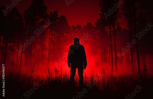 man, silhouette, forest, tree, night, red, dark, skittish, scarey, mysterious, ominous, creepy, horror, thriller, danger, fear, alone, isolated, figure, shadow, wood, landscape, eerie, haunted, mystical, supernatural, enigma, suspense, mystery, phantom, specter, gloom, darkness, fog, smoke, crimson, blood, fire, burning, intense