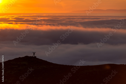Silhouette of a man on the ridge above the sea of clouds, misty mountains at sunset in Iceland