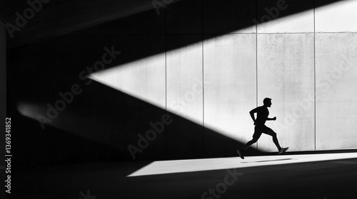 silhouette, man, running, black-and-white, light, shadow, contrast, wall, athlete, exercise, fitness, sport, motion, speed, urban, architecture, greyscale, outdoors, person, activity, training, building, monochrome, dynamic, shape, exterior, jogging, male, movement, runner, fast, modern, geometric, pattern, texture, design, strength, energy, black