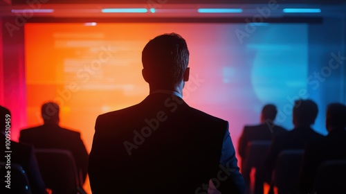 silhouette, man, standing, colourful, shadow, figure, contour, dark, outline, profile, shape, form, male, person, human, contrast, lighting, neon, stage, performance, presentation, conference, business, event, meeting, audience, crowd, spectator, observer, viewer, witness, guest, participant, spectacle, display, showcase, exhibition, platform, dais