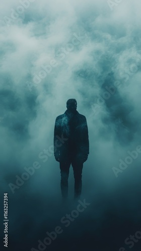 Silhouette of a man standing in thick fog.