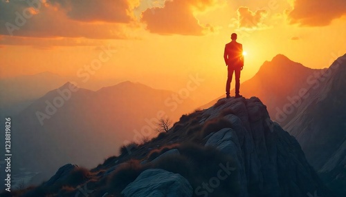 man, mountain, sunset, silhouette, peak, serene, hopeful, contemplation, standing, view, landscape, achievement, success, nature, golden hour, calm, peaceful, tranquil, solitude, journey, ambition, determination, backlit, travel, adventure, exploration, masculine, powerful, freedom, perspective, dream, goal, vision, inspiration, motivation, achieving