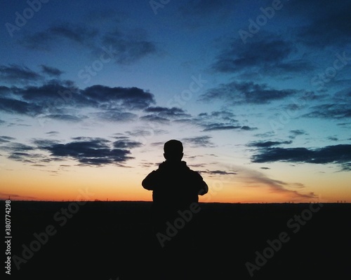 sunset, silhouette, orange, man, horizon, cloud, calm, blue, beautiful, caucasian, white, male, person, people, adult, adult, 20s, grown-up