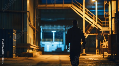 Silhouette of a man walking in an industrial facility at night, illuminated by warm lights, creating a dramatic and moody atmosphere.