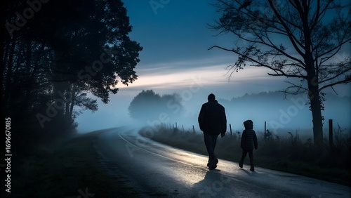 father, boy, son, children, fog, nature, outdoors, sunset, walking, adventure, forest, bond, calmness, aethereal, exploration, hope, horizontal, male, peaceful, serenity, silhouette, together, togetherness, calmness, two people, bonding, gold, holding hands, love, misty, people, shadow, sibling, back, backlit, color image, denmark, dreamlike, family, freedom, happy, light, photo, sun, tour, adult, childhood, evening