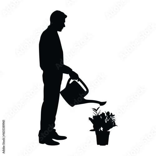 black, silhouette, man, watering, potted, plant, can, isolated, white, background, clear, clean, depiction, ideal, gardening, care, plant, related, visual, theme, garden, grow, green, nature, hobby, leisure, home, houseplant, horticulture, botanical, environment, eco, friendly, spring, summer, male, figure, human, minimalist, graphic, design, vector, illustration, art, concept, agriculture, cultivate