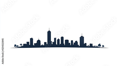 Silhouette of a modern city skyline with trees in the foreground against a white background