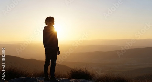 silhouette, person, sunset, mountain, landscape, gold, hazy, peaceful, contemplation, nature, outdoors, sky, horizon, vista, viewpoint, overlook, summit, peak, hill, ridge, vale, light, shadow, sun, sunlight, sunbeam, glow, warm, tranquil, serene, calm, quiet, solitude, alone, thinking, dreaming, inspiration, motivation, adventure, travel, tour tourism, vacation, journey, exploration, discovery, freedom, escape, wanderlust