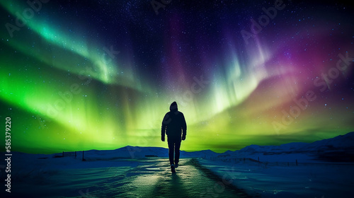 silhouette of a person in a forest, Man walking away. northern lights galaxies surreal. Generative Ai