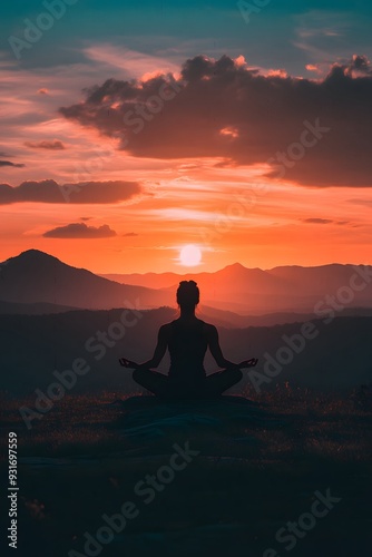 Silhouette of a person in a meditative lotus position on a hilltop at sunset. The scene captures the serenity and tranquility of yoga practice against the backdrop of a beautiful sunset.