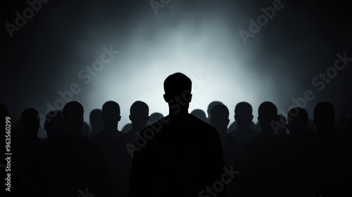 Silhouette of a person in front of a dark crowd, evoking themes of individuality, presence, and mystery in a dramatic atmosphere. high quality