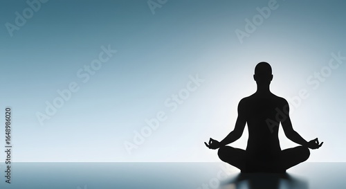silhouette, meditation, yoga, practice, pose, lotus, posture, calm, peace, balance, relaxation, zen, body, mind, spirit, energy, well-being, awareness, sharpened, breath, inner, calmness, health, lifestyle, spiritual, harmony, connection, self, exercise, training, guidance, illustration, graphic, design, art, shape, figure, human, person, individual, dark, shadow, light, background, gradient, blue, abstract, simplicity