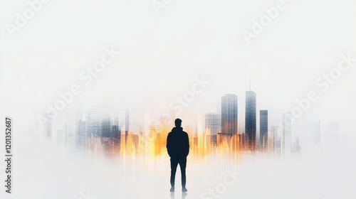 Silhouette of a Person overlooking a City at Dawn with Soft Fog, Capturing a Sense of Isolation, Reflection, and Urban Beauty in a Dreamlike Landscape