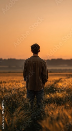 Silhouette of a person standing in a vast open field during sunset with warm orange hues