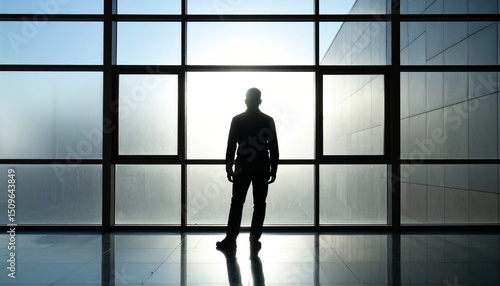 Silhouette of a person standing in front of a large window