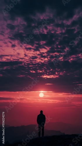 silhouette, person, sunset, sky, cloud, hill, mountain, horizon, red, purple, dark, vibrant, colours, dramatic, standing, gazing, contemplation, nature, outdoors, view, atmosphere, warm, cool, light, stillness, solitude, alone, moment, peaceful, serene, beauty, landscape