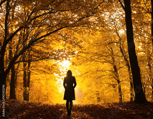 Silhouette of a person walking through a forest in autumn. Warm glowing effect from sunlight. Nature and the outdoors. Solitude and contemplation.