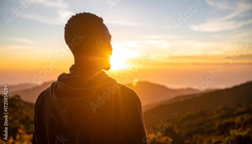 silhouette, sunrise, person, mountain, golden hour, contemplation, landscape, warm light, calmness, view, nature, horizon, sky, hill, dawn, peaceful, serene, adventure, backlight, hope, freedom, inspiration, solitude, travel, exploration, discovery, morning, expansive, dramatic