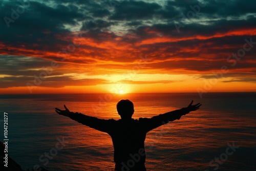 silhouette of a person with arms outstretched against a vibrant sunset over the ocean