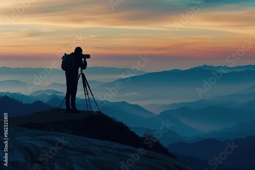 Silhouette of a photographer who shooting a sunset on the mountain
