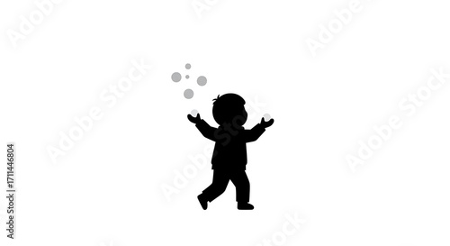 Silhouette of a playful child juggling bubbles in a fun with white background.