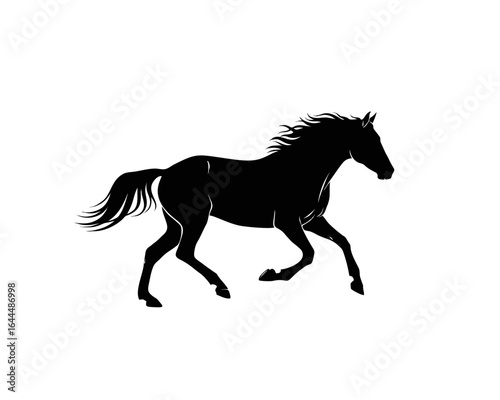 Silhouette of a powerful black horse in full stride, its mane and tail flowing dynamically against a stark white background.