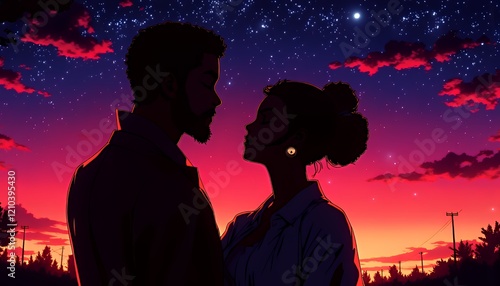 Silhouette of a Romantic African American Couple Under a Starlit Sunset Sky, Digital Pixel Art Illustration for Valentine's Day