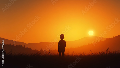 Silhouette of a Sad Boy in a Meadow at Sunset: Capturing Emotional Distress and Childhood Vulnerability in Stock Photography with Empty Space for Text