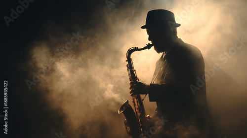 Silhouette of a saxophonist playing passionately in a smoky atmosphere during a jazz performance