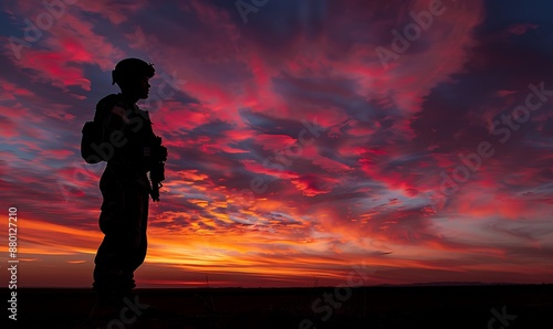 silhouette, soldier, sunset, sky, dramatic, cloud, red, orange, pink, purple, military, weapon, gun, helmet, field, horizon, landscape, standing, backlit, evening, gold, twilight, dark, shadow, ground, grass, nature, outdoors, patriotism, service, protection, brave, hero, uniform