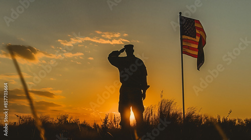 Silhouette of a soldier saluting an American flag at sunset, powerful and reflective Independence Day --ar 16:9 Job ID: d46084c0-007e-4b2f-83ca-f4dc4c563806