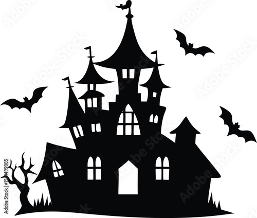 Silhouette of a spooky haunted castle with bats isolated on white