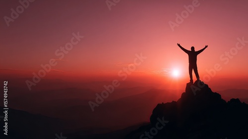 man, silhouette, mountain peak, success, victory, sunrise, red, sky, orange, achievement, celebration, arms raised, freedom, landscape, adventure, hiking, climbing, summit, travel, nature, exploration, inspiration, motivation, confidence, positive, energy, passion, journey, goal, challenge, determination, strength, ambition, courage, persistence, optimism, hope, new day, mindfulness, spirituality, zen, peaceful, calmness, serenity, relaxation, contemplation