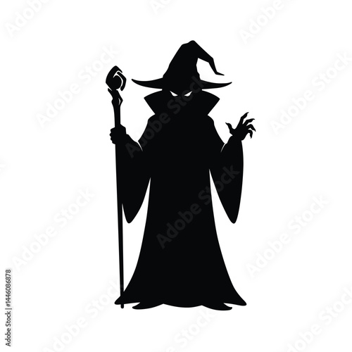 magician, sorcerer, sorcerer, mage, magic, silhouette, black, fantasy, halloween, witchcraft, mystical, mysterious, occult, cloak, staff, hat, evil, character, cartoon, vector, illustration, clip art, drawing, isolated, skittish, dark, scarey