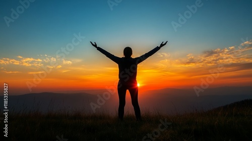 Silhouette of a woman at sunset, arms outstretched, feeling the freedom and peace of nature.