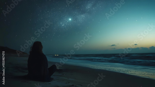 night, beach, ocean, sea, star, sky, starry, milky way, cosmos, woman, girl, silhouette, alone, solitude, contemplation, meditation, peaceful, calm, serene, tranquil, dark, blue, horizon, wave, sand, coast, shore, landscape, nature, night sky