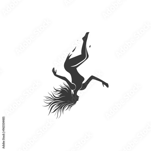 silhouette, woman, falling, hair, flowing, body, pose, black, white, background, design, graphic, art, illustration, style, abstract, feminine, motion, graceful, movement, dynamic, elegant, dramatic, concept, freedom