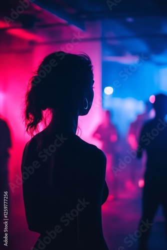 nightclub, neon, silhouette, woman, dark, club, concert, party, light, vibrant, atmosphere, music, entertainment, crowd, event, nightlife, dance, colourful, female, back, view, modern, trendy, stylish, artistic, creative, glow, abstract, mystery, mood, energy, fun, leisure, celebration, illuminated, bokeh, blurred, background