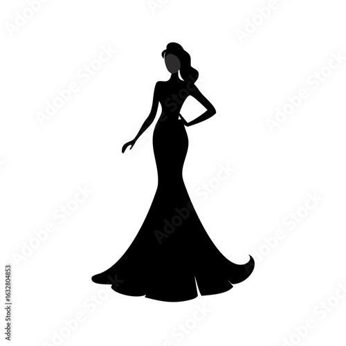 silhouette, woman, elegant, gown, dress, train, hair, black, white, fashion, style, beauty, model, lady, female, figure, pose, chic, glamour, design, art, illustration, vector, clip art, icon, symbol, graphic, drawing, artwork, image, picture, clip, shape, form, outline, contour, bodice, skirt, waist, shoulder, arm, hand, neck, coiffure, curl, wavy, formal, event, party