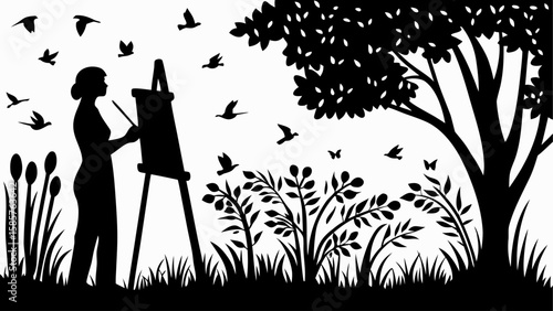 silhouette, woman, painting, easel, nature, bird, tree, art, peaceful, scene, artist, canvas, brush, foliage, grass, plant, wildlife, serene, landscape, artwork, creative, black, white, illustration, design, drawing, graphic, vector, image, clip art, element, symbol, icon, shape, outline, abstract, style, decorative, artistic