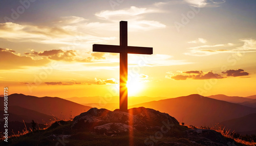 Silhouette of a wooden cross on a hilltop with golden sunset and glowing rays, symbolizing faith, hope, sacrifice, and spiritual peace in a dramatic natural landscape, cross on sunset
