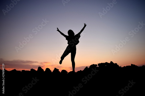 sky, girl, happy, silhouette, joy, jump, sunset, summer, sun, colourful, fun, sport, sunrise, woman, shadow, enjoy, happiness, victory, compete, freedom, dream, succeed, celebration, success