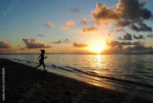Silhouette of an unrecognizable girl running on the beach at sunset, with golden reflections in the water