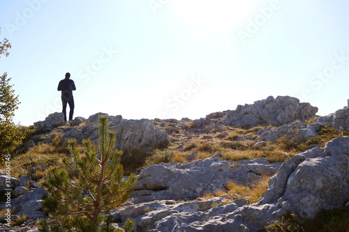Silhouette of an unrecognizable man hiking on mountain Biokovo in Dalmatia, Croatia on a sunny day.